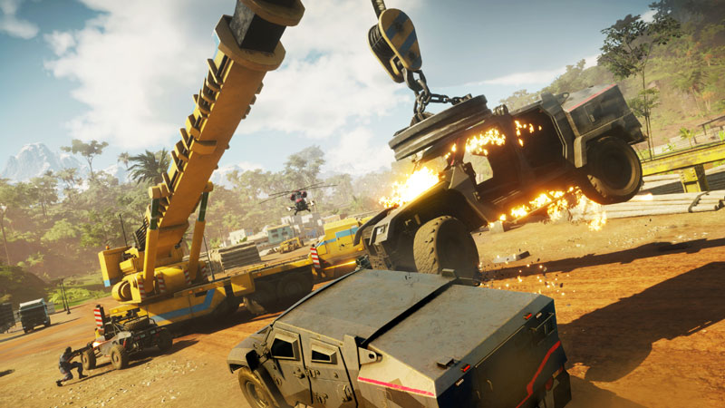 Otra de las grandes características de Just Cause 4 está en el manejo de vehículos. Estos pueden aprovecharse de la manera más simple como viajar de un lado a otro en un helicóptero o haciendo que un tanque flote con un poco de creatividad para que, desde el aire, puedas derrumbar tanques de gas en las zonas más lejanas. Esto última lo logras cuando aprendes a aprovechar las libertades que te da la física detrás de la motor del juego y las combinas con las herramientas que vienen con el grappling hook.