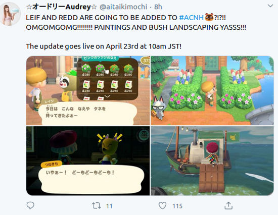 @aitaikimochi dejó ver acerca de Animal Crossing: New Horizons ‘¡¡LEIF Y REDD SE AÑADIRÁN A #ACNH?!? !! OMGOMGOMG !!!!!!!! ¡PINTURAS Y PAISAJES DE ARBUSTOS!’.