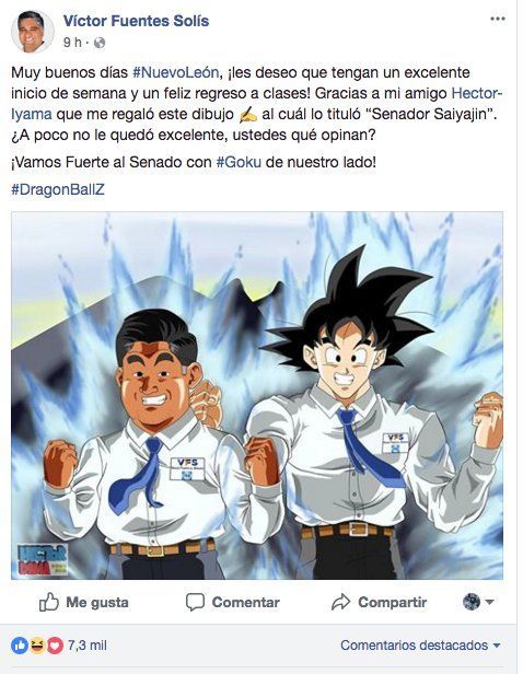 Pues quizá después de darse cuenta de la sensación que causa este anime, el senador con licencia Víctor Fuentes Solís, de San Nicolas en Nuevo León, México; compartió una imagen a través de Facebook en donde se auto proclama Senador Super Saiyajin.