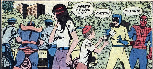 Existe un precedente de la detención de Thanos en los cómics. En un número de 1979 Marvel editó un cómic en donde, este villano busca a un niño llamado Jim, este niño que tiene el cubo cósmico, que está hecho de Teseracto, material que es el punto débil del villano. Al final después de intentarlo, termina detenido por la policía.