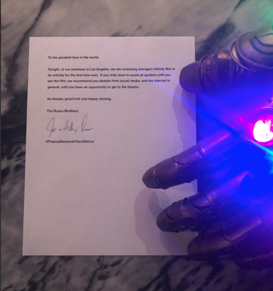 En este tweet igual que en el pasado, estos famosos hermanos, postearon una foto de una carta al lado del guantelete del infinito, con el mismo #Thanosdemandatusilencio. La carta literalmente se lee: