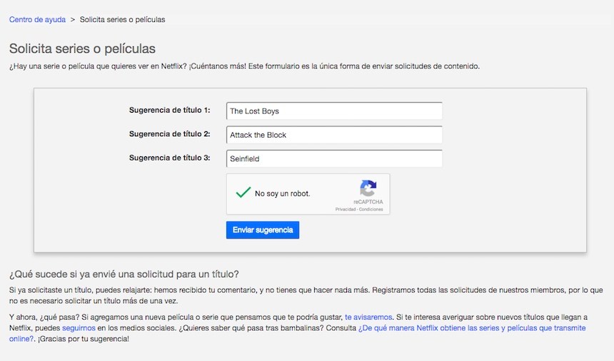 Así es, la compañía ha decidido hacerla de genio de la lámpara mágica, porque creó una sección de peticiones donde pueden sugerir las series o películas que les gustaría encontrar. Esta página funciona de una manera muy sencilla: tan sólo dan clic a este enlace, ingresan a su cuenta de Netflix, ponen el contenido que ustedes gusten en el formulario y listo.