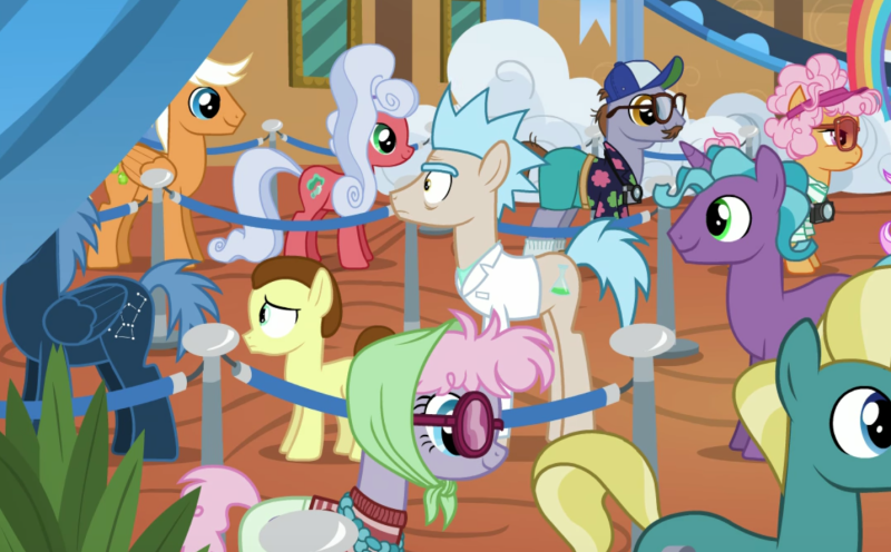 Un plus de esta serie es que tiene miles de referencias a cultura pop, así que no es sorpresa que Rick y Morty tenga una aparición en My Little Pony: Friendship is Magic, en este episodio los podemos ver a este par formado, en una toma.