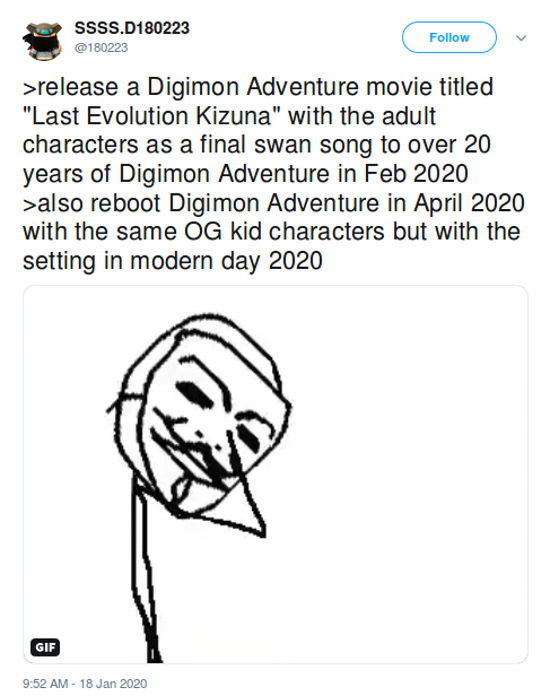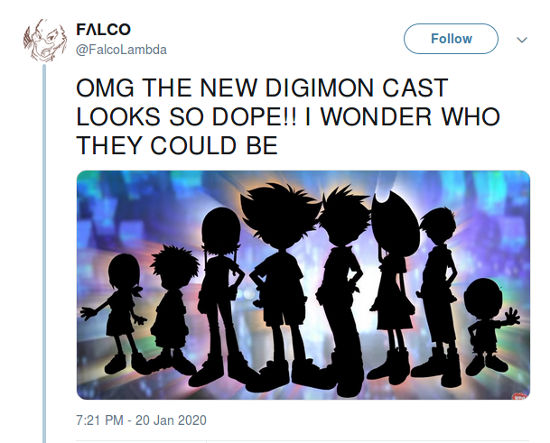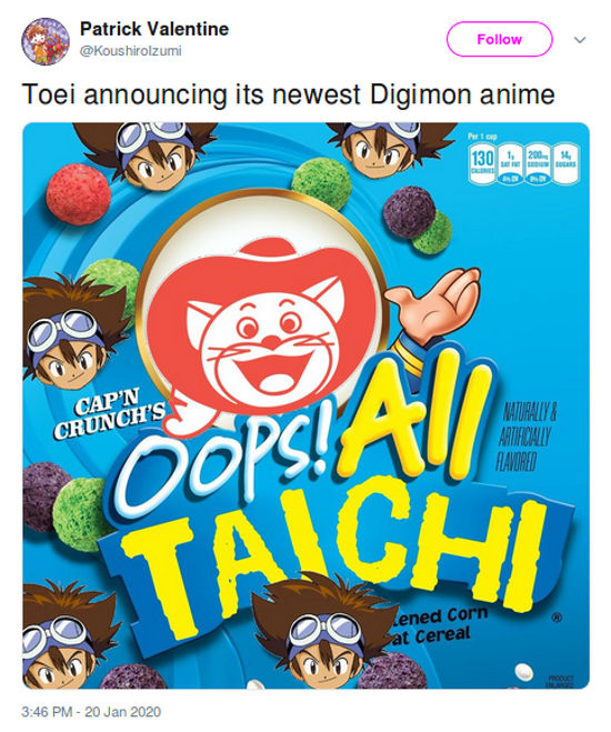 @KoushiroIzumi siguió esta línea, y al decir “Toei anuncia su nuevo anime Digimon” muestra una imagen de Taichi como si fuera un cereal para desayunar. Otro fan, @Fairimon92, empezó a decir “estoy bastante entusiasmado con el reinicio de Digimon Adventure (2020)”.