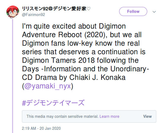 Mas después añadió “pero todos los fans de Digimon sabemos que la serie que merece en verdad una continuación es Digimon Tamers 2018 después del CD de drama Days -Information and the Unordinary- de Chiaki J. Konaka”.