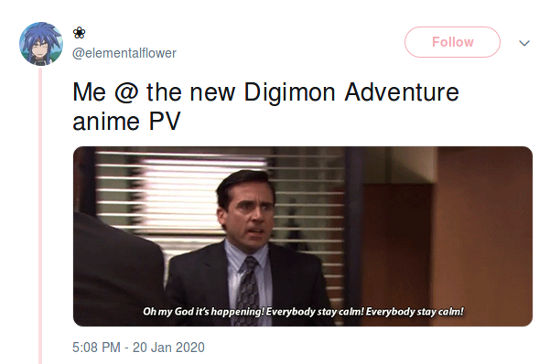 @elementalflower fue más entusiasta, y lo que sintió se refleja en la imagen que acompañó del comentario “Yo @ el nuevo anime tráiler de Digimon Adventure”.