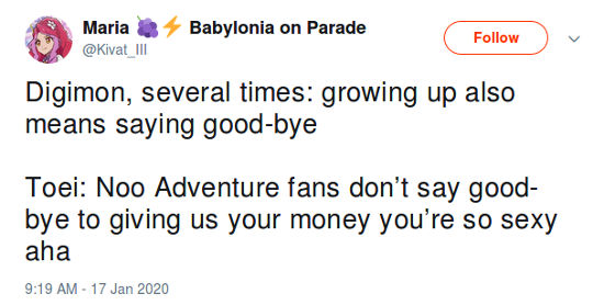 “Digimon, varias veces: crecer también significa decir adiós. Toei: Nooo, fans de Adventure no se despidan, dennos dinero, son tan sexys aha”, resaltó.