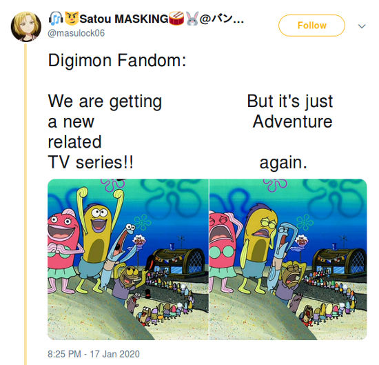 @masulock06 terminó diciendo “Fandom de Digimon: ¡¡Estamos consiguiendo una nueva serie de TV!! Pero es solo Adventure de nuevo”.