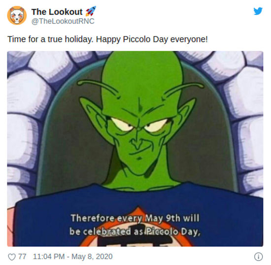 @TheLookoutRNC mostró una captura del anime, y dijo ‘tiempo para un verdadera celebración. ¡Feliz Día de Piccolo a todos!’.