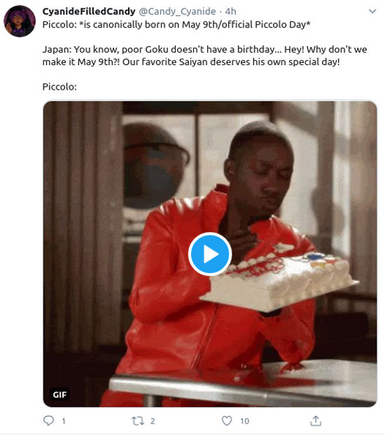 @Candy_Cyanide explicó ‘Piccolo: *nace canónicamente el 9 de mayo / Día Oficial de Piccolo*. Japón: Sabes, el pobre Goku no cumple años… ¡Oye! ¿Por qué no lo hacemos el 9 de mayo? ¡Nuestro saiyajin favorito merece su propio día especial! Piccolo:’. Lo que dice es cierto según el manga y anime.