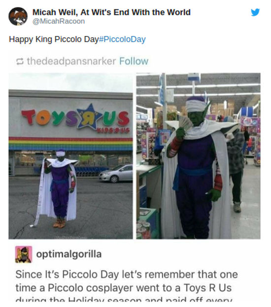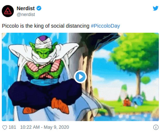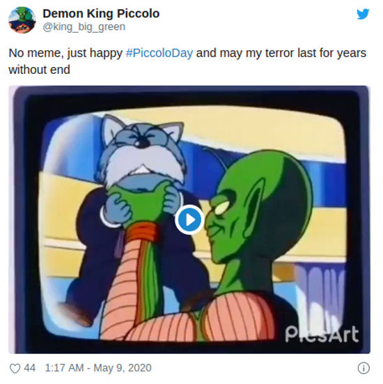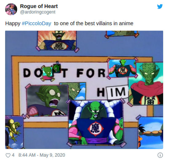 @MicahRacoon mostró un cosplay, y señaló de nuevo ‘Feliz Día del Rey Piccolo’, y @nerdist nos recordó ‘Piccolo es el rey del distanciamiento social’. @ardoringcogent mezcló su mensaje con un meme de Los Simpson, diciendo ‘feliz #PiccoloDay a uno de los mejores villanos del anime’.