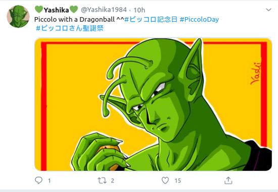@Yashika1984 compartió una ilustración, destacando ‘Piccolo con una Dragon Ball [Esfera del Dragón]^^’. @king_big_green remató con ‘no meme, solo feliz #PiccoloDay y que mi terror dure por años sin fin’.