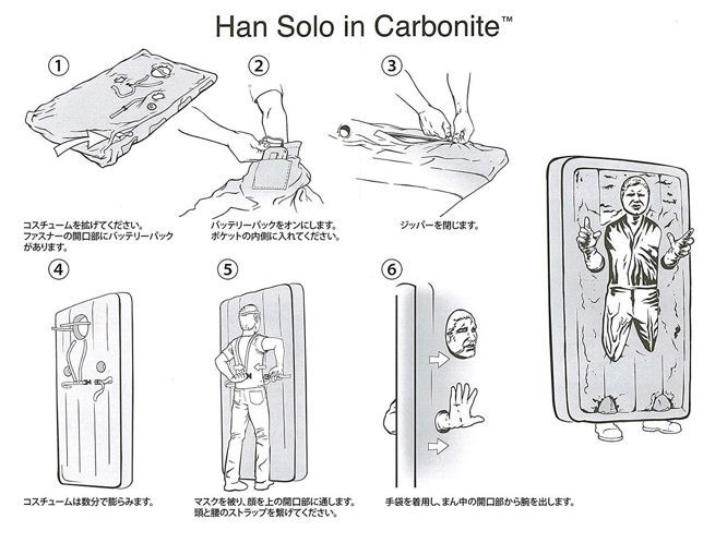 Primero que nada necesitarás tener buenos pulmones pues debes inflar bien el traje. Luego pones tu rostro sobrepuesto al de Harrison Ford como Han Solo. Realmente es algo complicado de llevar, sin embargo, serás el alma de la fiesta, igual y consigues que una princesa Leia te descongele con todo y un beso.
