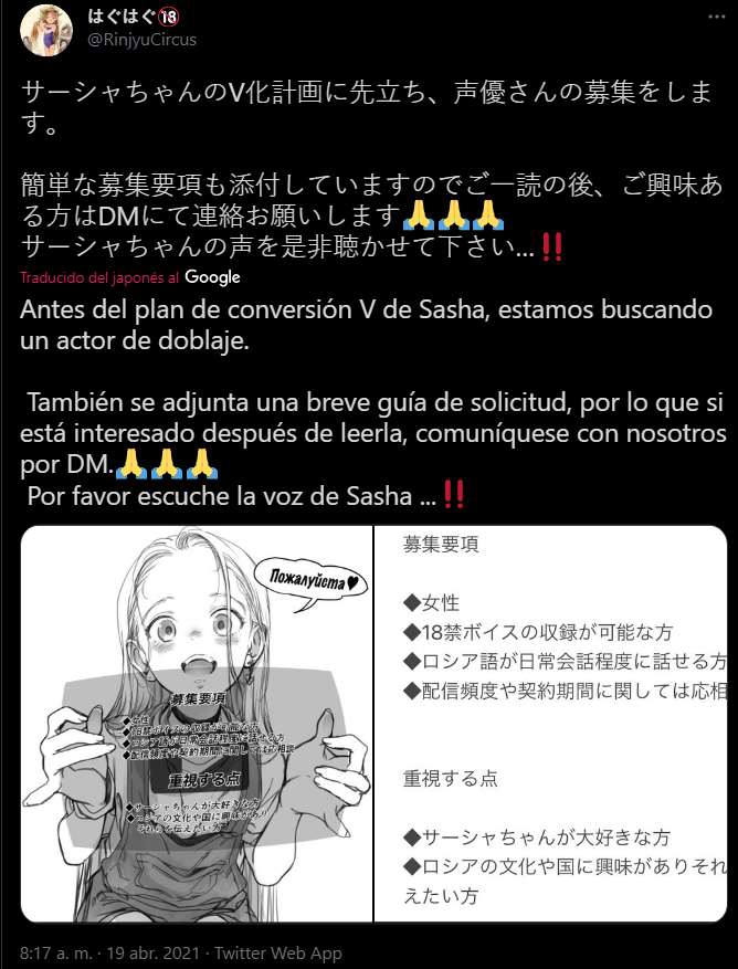 Recientemente, un mangaka de hentai, RinjyuCircus compartió esta convocatoria en su cuenta personal de twitter junto a una imagen de Sasha-chan, la chica a quién podrías dar voz. Tienes hasta el 19 de mayo para mandar tu solicitud para este trabajo remoto. Si no conoces a su personaje, ella es una estudiante rusa de intercambio que vive en Japón.