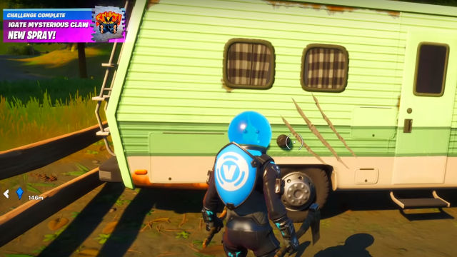 Debemos ver un remolque azul y morado, y detrás de éste, habrá uno verde. Es precisamente en este donde esta el último zarpazo, y se termina el reto de investiga las garras misteriosas Fortnite.
