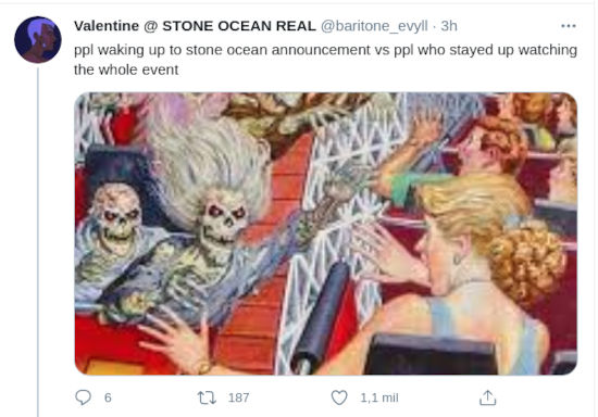 @baritone_evyll dejó ver a través de su comentario lo temprano que fue el anuncio, al decir ‘personas que se despiertan con el anuncio de Stone Ocean vs quienes se quedaron despiertas viendo todo el evento’.