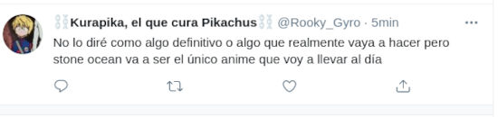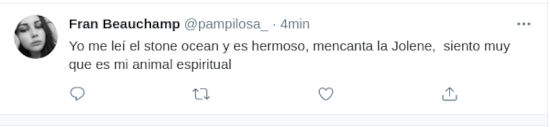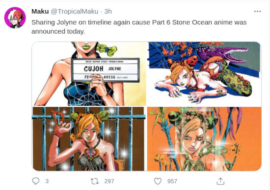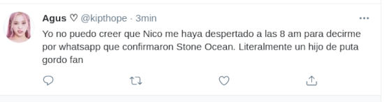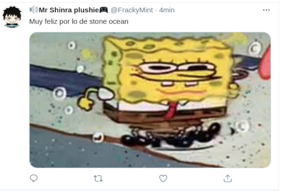 Como era de esperarse, los fans se volcaron a Twitter para expresar su alegría. @7Shizuka9 prefirió que una imagen dijera más que mil palabras, y por eso su mensaje solo dice ‘*se anuncia Stone Ocean – Jojo Fandom:’.