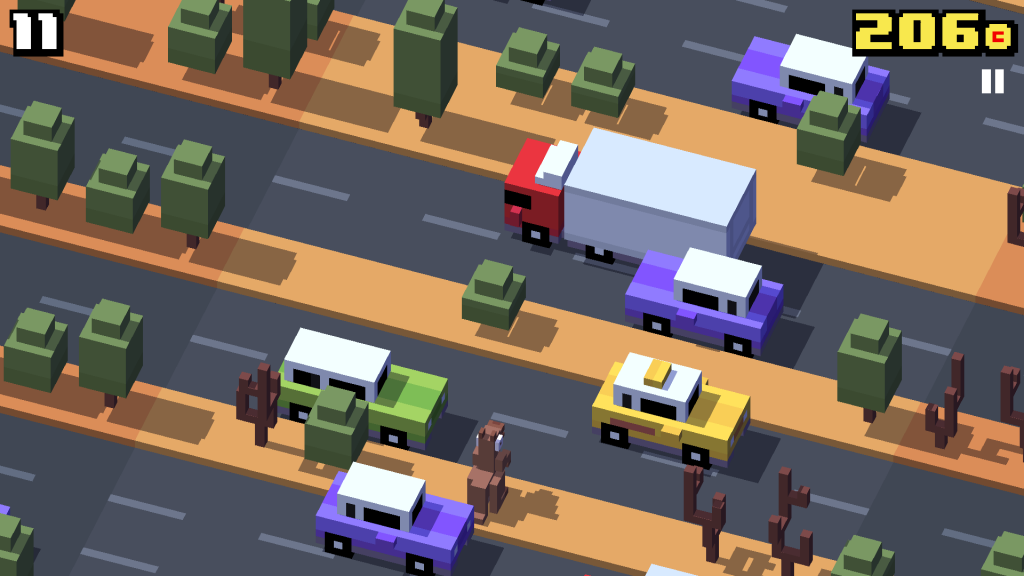 Crossy Road sigue esta misma fórmula, atrayéndola a la época actual con unos gráficos pixelados muy llamativos. Al iniciar el juego controlaremos un pollo el cual también por alguna razón quiere cruzar las calles llenas de autos, ríos con una cantidad excesiva de troncos flotando y vías de trenes.