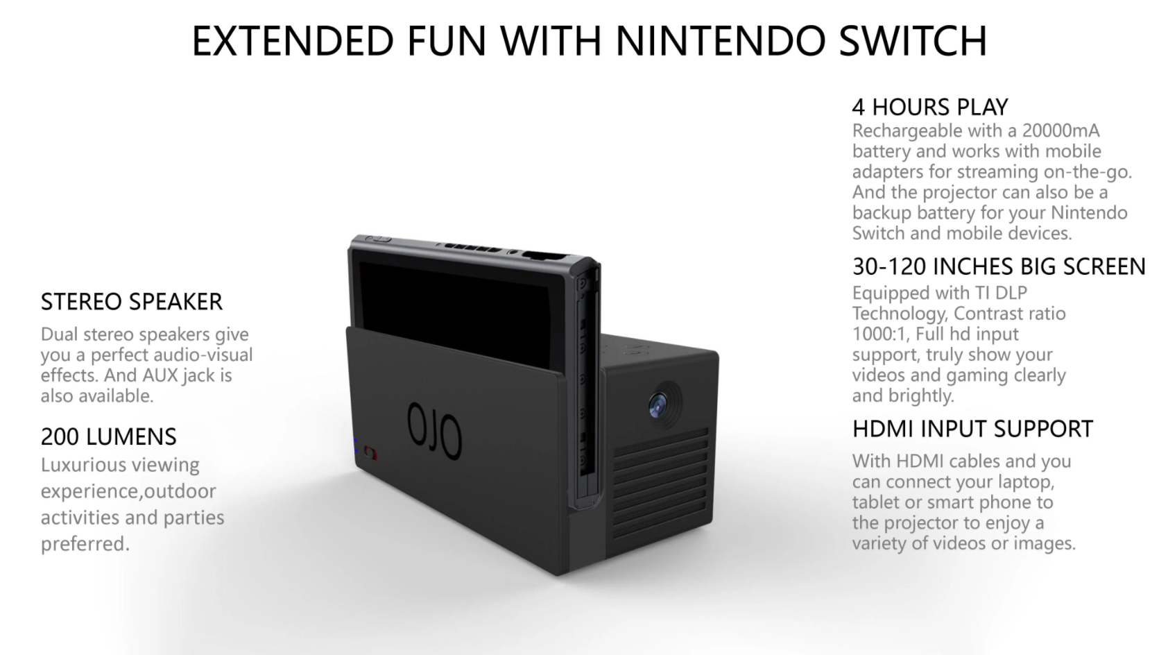 YesOJO ha diseñado un dock que cumple la función de proyector para la Switch. El proyector tiene compatibilidad Full HD, además de contar con soporte HDMI. Sonido estéreo y un jack auxiliar. Podrás proyectar imagen de 30 a 120 pulgadas y jugar durante 4 horas continuas.