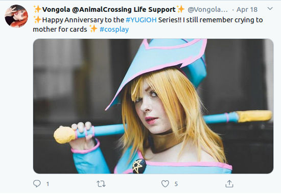 @VongolaPrima afirmó ‘✨Feliz aniversario de la serie #YUGIOH !! Todavía recuerdo haberle llorado a mi mamá por las cartas ✨ #cosplay’.