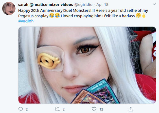 Ella fue una de las personas que compartió un cosplay basado en este anime. Igualmente, @egirldio presumió el suyo, diciendo ‘¡Feliz vigésimo aniversario Duel Monsters! Aquí hay un autorretrato de un año de mi cosplay de Pegasus ¡Amo hacer cosplay de él, me siento muy rudo! ✌️ # yugioh’.