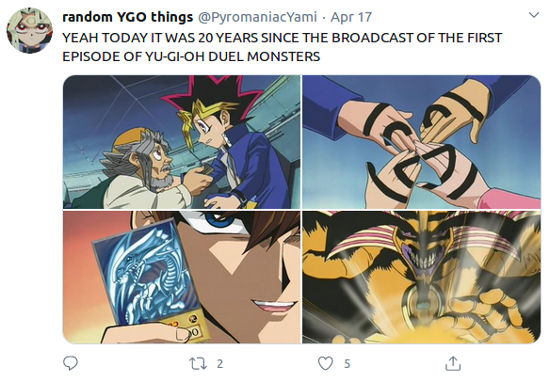 @PyromaniacYami resaltó entusiasmado ‘si, hoy hace 20 años desde la transmisión del primer episodio de Yu-Gi-Oh! Duel Monsters’.
