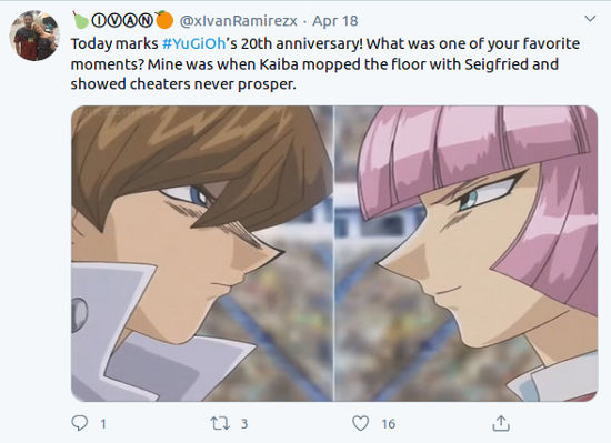 @xIvanRamirezx recordó un gran momento diciendo ‘¡hoy se cumple el vigésimo aniversario de # YuGiOh! ¿Cuál fue uno de tus momentos favoritos? El mío fue cuando Kaiba ‘trapeó el piso’ con Seigfried y mostró que los tramposos nunca prosperan’.